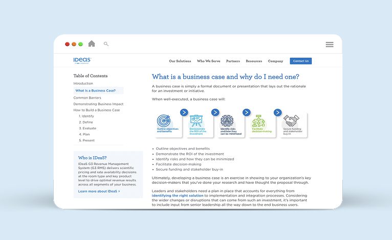IDeaS bietet 24/7-Live-Kundensupport und Schulungsressourcen, um Benutzern bei der effektiven Implementierung und Nutzung des IDeaS-Systems zu helfen. Wir haben maßgeschneidertes Projektmanagement und Schulungen, um Ihnen zu helfen, vom ersten Tag an und darüber hinaus Umsatzsteigerungen zu erzielen.