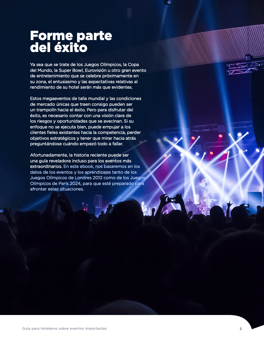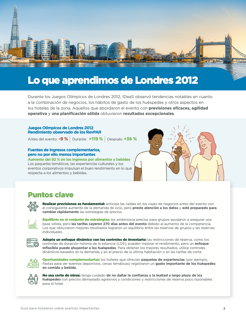 Durante los Juegos Olímpicos de Londres 2012, IDeaS observó tendencias notables en cuanto a la combinación de negocios, los hábitos de gasto de los huéspedes y otros aspectos en los hoteles de la zona. Aquellos que abordaron el evento con previsiones eficaces, agilidad operativa y una planificación sólida obtuvieron resultados excepcionales. En este ebook, nos basaremos en los datos de los eventos y los aprendizajes tanto de los Juegos Olímpicos de Londres 2012 como de los Juegos Olímpicos de París 2024, para que esté preparado para afrontar estas situaciones.