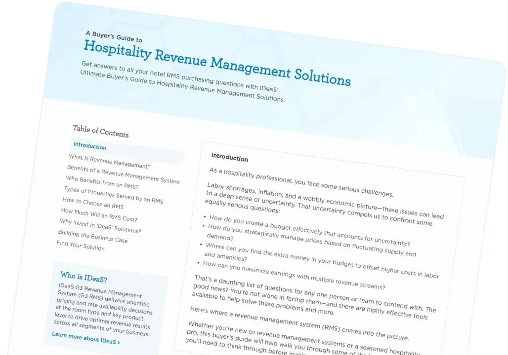 IDeaS meets you where you are and grows with your business. Our hotel revenue management software uses AI and data science to provide actionable insights that adapt to your property, market, and demand. With no steep learning curve, your team can make confident revenue decisions quickly and without complexity or guesswork.