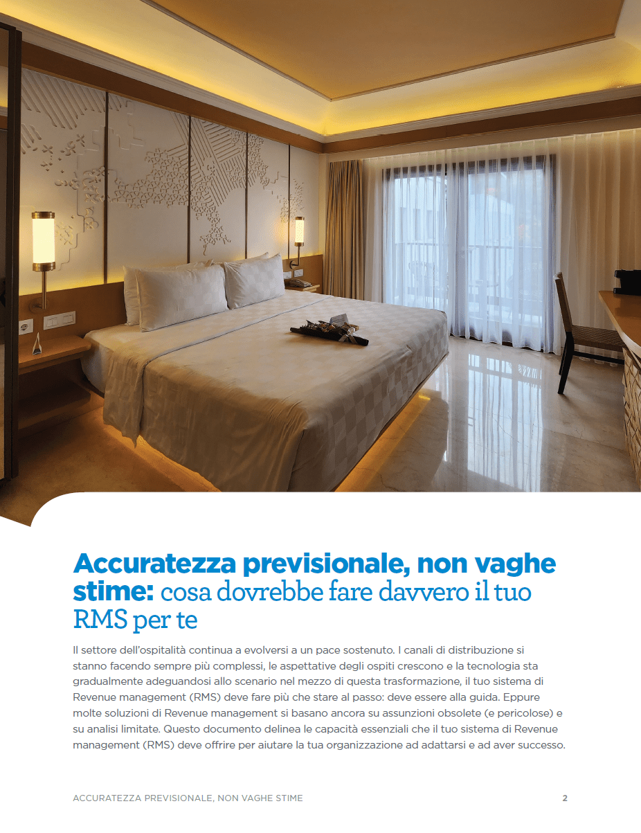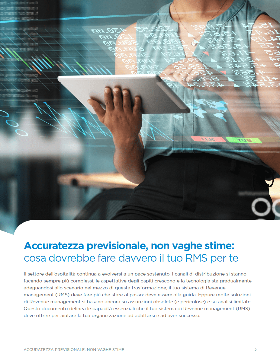 Il settore dell’ospitalità continua a evolversi a un pace sostenuto. I canali di distribuzione si stanno facendo sempre più complessi, le aspettative degli ospiti crescono e la tecnologia sta gradualmente adeguandosi allo scenario nel mezzo di questa trasformazione, il tuo sistema di Revenue management (RMS) deve fare più che stare al passo: deve essere alla guida. Eppure molte soluzioni di Revenue management si basano ancora su assunzioni obsolete (e pericolose) e su analisi limitate. Questo documento delinea le capacità essenziali che il tuo sistema di Revenue management (RMS) deve offrire per aiutare la tua organizzazione ad adattarsi e ad aver successo.